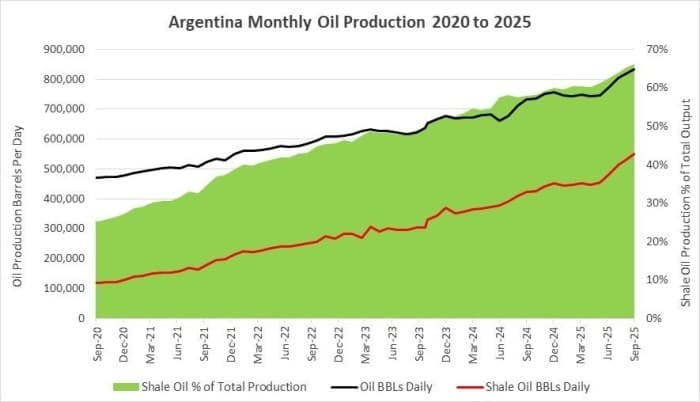 Los datos de cierre del ejercicio 2025 certifican el despegue de Vaca Muerta. En diciembre, Argentina alcanzó una producción récord de 861.380 bpd, lo que supone un incremento del 14% interanual. El dominio de los hidrocarburos no convencionales es total: el shale oil es el gran protagonista con el 69% del crudo nacional, mientras que el shale gas representa el 65% en lo que se refiere a la matriz gasística.