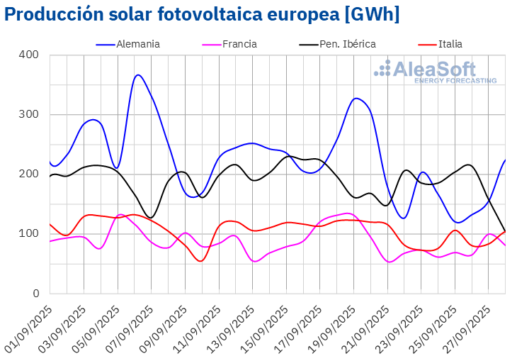 En la semana del 22 de septiembre, la producción solar fotovoltaica disminuyó en los principales mercados eléctricos europeos en comparación con la semana anterior, revirtiéndose la tendencia alcista de la semana previa. El mercado alemán experimentó la mayor caída, del 34%. Le siguieron los mercados italiano y francés, con descensos del 27% y 26%, respectivamente. Los descensos fueron relativamente menores en la península ibérica. En el mercado español la generación con energía fotovoltaica cayó un 7,5% y en el mercado portugués un 4,3%. En este último caso, esta tendencia a la baja continuó por segunda semana consecutiva.