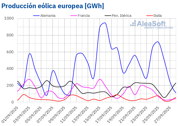 En la semana del 29 de septiembre, según las previsiones de producción eólica de AleaSoft Energy Forecasting, la producción eólica aumentará en el mercado italiano y disminuirá en los mercados alemán, francés, español y portugués.