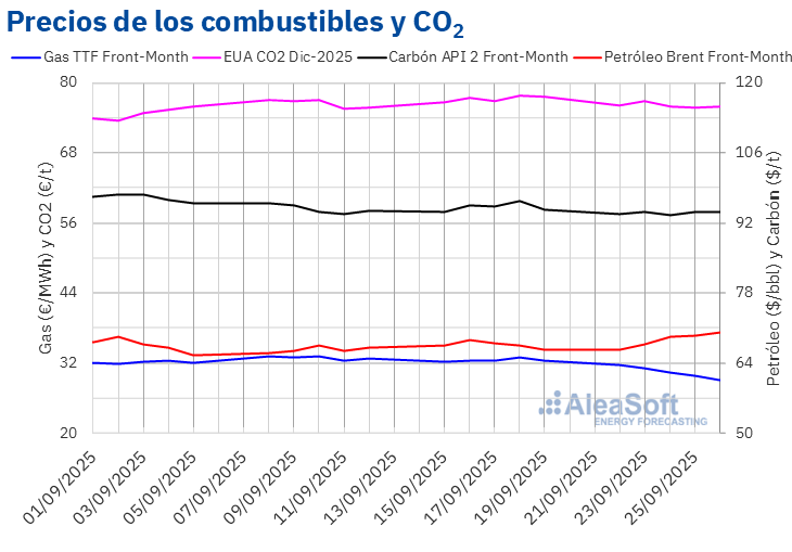 En la cuarta semana de septiembre, los precios de los futuros de gas TTF continuaron por debajo de 33 €/MWh favorecidos por el suministro abundante de gas natural licuado. También contribuyó a este comportamiento los niveles de las reservas europeas, cuyo promedio supera el 80% y en algunos países ya se sitúa por encima del 90%.