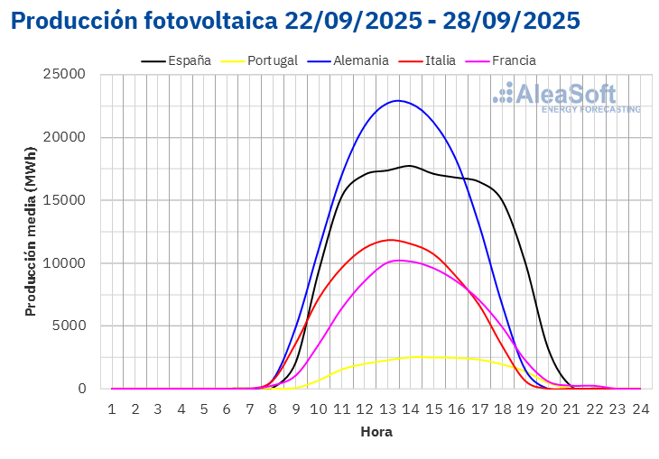Durante la semana del 29 de septiembre, según las previsiones de producción solar de AleaSoft Energy Forecasting, la tendencia a la baja se revertirá, con un aumento de la producción solar fotovoltaica en los mercados italiano y alemán. Sin embargo, el mercado español experimentará un descenso de la producción solar.