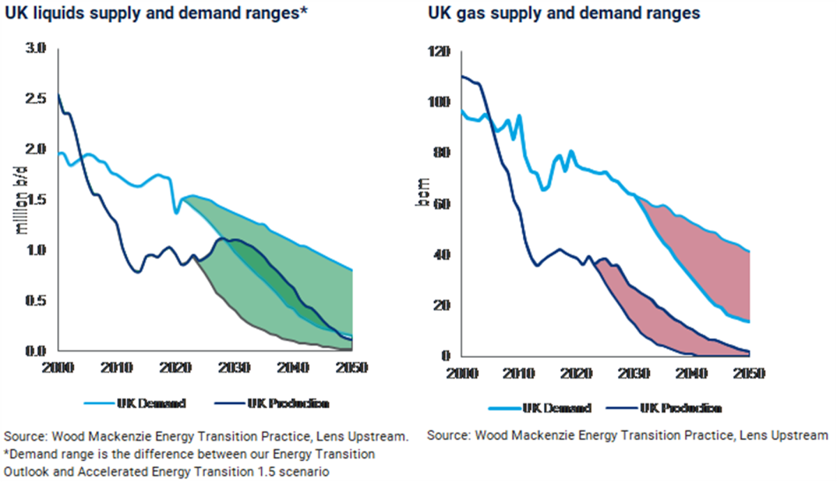 Según Wood Mackenzie, la demanda de petróleo y gas en el Reino Unido seguirá superando la oferta, pero existen amplios rangos de incertidumbre. En 2030, la producción estará entre 0,6 millones de barriles de petróleo equivalente al día (mmboe/d) y 1,6 mmboe/d; el rango de demanda es aún más amplio.