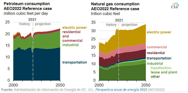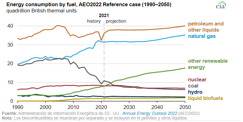 La Administración de Información Energética de EEUU (EIA) en su caso de referencia _Annual Energy Outlook 2022 (AEO2022), _proyecta que el consumo de energía de EEUU crecerá hasta 2050, impulsado principalmente por el crecimiento demográfico y económico. En este caso, que refleja solo las leyes y regulaciones vigentes, la energía renovable es la fuente de energía de más rápido crecimiento hasta 2050, y el petróleo seguirá siendo la principal fuente del consumo de energía durante ese período, seguida por el gas natural.