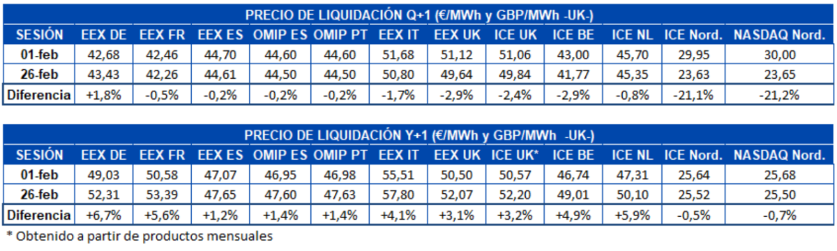La recuperación de las temperaturas respecto al mes anterior favoreció el descenso de los precios de los mercados eléctricos en febrero. Además, la producción solar en Europa también fue mayor a la del mes de enero y la producción eólica aumentó en países como Alemania, Francia o Portugal, contribuyendo también al descenso de los precios. Otro factor que favoreció este descenso fue la disminución de los precios del gas.
