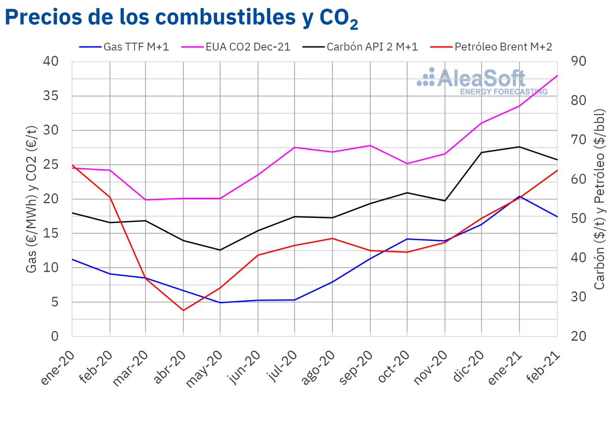 En cuanto a los futuros de gas TTF en el mercado ICE para el mes de marzo de 2021, alcanzaron su precio de cierre máximo mensual, de 20,18 €/MWh el lunes 8 de febrero. Pero posteriormente los precios descendieron y el precio de cierre mínimo mensual, de 15,93 €/MWh, se alcanzó el día 25 de febrero. Este precio fue el más bajo desde diciembre de 2020.