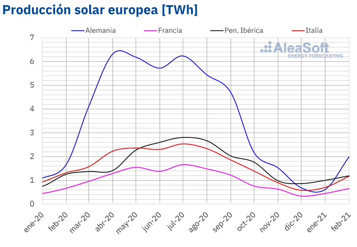 La producción solar aumentó en todos los mercados eléctricos europeos en febrero respecto a enero de 2021, en correspondencia con el aumento progresivo de las horas de sol. El mayor incremento se registró en el mercado alemán, con un 258%. En Italia, Francia y España también se registraron incrementos significativos, del 84%, 60% y 34%, respectivamente. En el caso de Portugal, el aumento fue de un 5,7%.