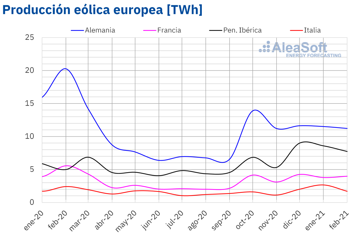 En cuanto a la producción eólica, en febrero de 2021 aumentó respecto a enero en la mayoría de mercados. La variación registrada en Francia, del +17%, fue la mayor de los mercados analizados. Sin embargo, en Italia y España la producción con esta tecnología bajó un 30% y 2,8% respectivamente.