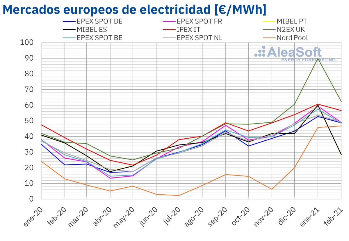 En el mes de febrero de 2021, el precio promedio mensual fue superior a los 45 €/MWh en casi todos los mercados eléctricos europeos analizados en AleaSoft. La excepción fue el mercado MIBEL de Portugal y España, con promedios de 28,19 €/MWh y 28,49 €/MWh, respectivamente, posicionándose como el de menor precio promedio de Europa, algo que no pasada desde marzo de 2014. En cambio, el precio promedio mensual más elevado, de 62,32 €/MWh fue el del mercado N2EX de Reino Unido, seguido por el del mercado IPEX de Italia, de 56,57 €/MWh. En el resto de los mercados, los promedios estuvieron entre los 46,84 €/MWh del mercado Nord Pool de los países nórdicos y los 49,23 €/MWh del mercado EPEX SPOT de los Países Bajos.