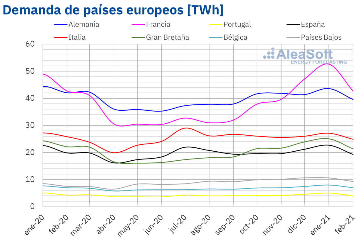 La caída interanual de las temperaturas medias causó la subida de la demanda eléctrica en la mayoría de los mercados de Europa en el segundo mes de 2021 respecto a febrero de 2020. En la mayoría de mercados las temperaturas medias descendieron más de 1,4 °C. Las variaciones de demanda más significativas fueron los incrementos de Francia y Bélgica, que superaron el 3,5% en términos interanuales. Sin embargo, en Alemania, donde las temperaturas medias bajaron 3,5 °C, la demanda registró un descenso del 2,5%.