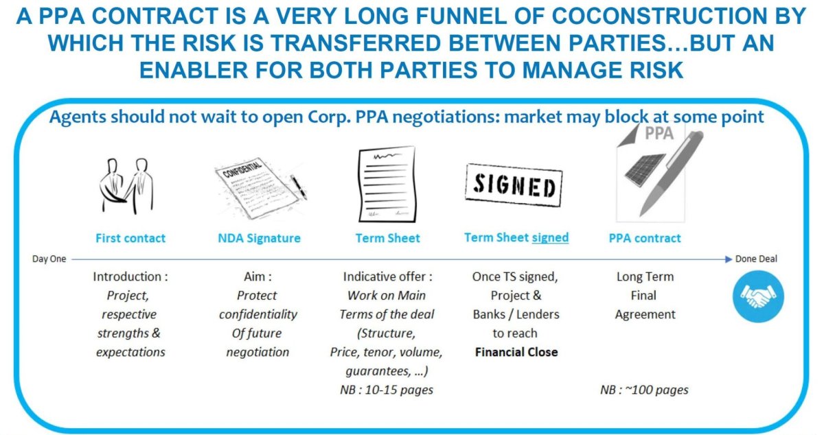 A la hora de negociar un contrato de compraventa de energía a largo plazo, la mentalidad no debe ser la de conseguir el precio más económico posible, sino ser la de conseguir un precio para el que el modelo financiero estime el rendimiento esperado, teniendo en cuenta que ese será un precio firme sin el riesgo de la volatilidad de los precios del mercado spot o de futuros.