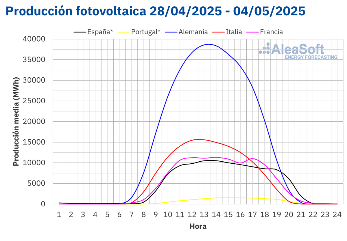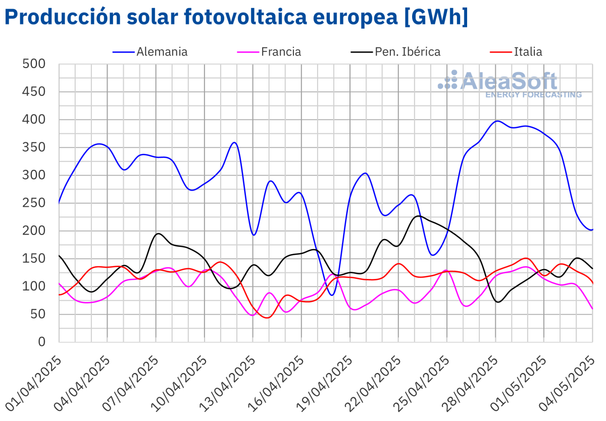 Durante la semana, varios mercados europeos alcanzaron récords históricos de producción solar fotovoltaica. El 28 de abril, Alemania alcanzó su mayor producción solar fotovoltaica para un mes de abril, con 397 GWh. El 30 de abril, Francia registró su récord histórico de producción con esta tecnología, con 135 GWh, y ese mismo día, Italia también alcanzó su máximo histórico, con una producción de 150 GWh.