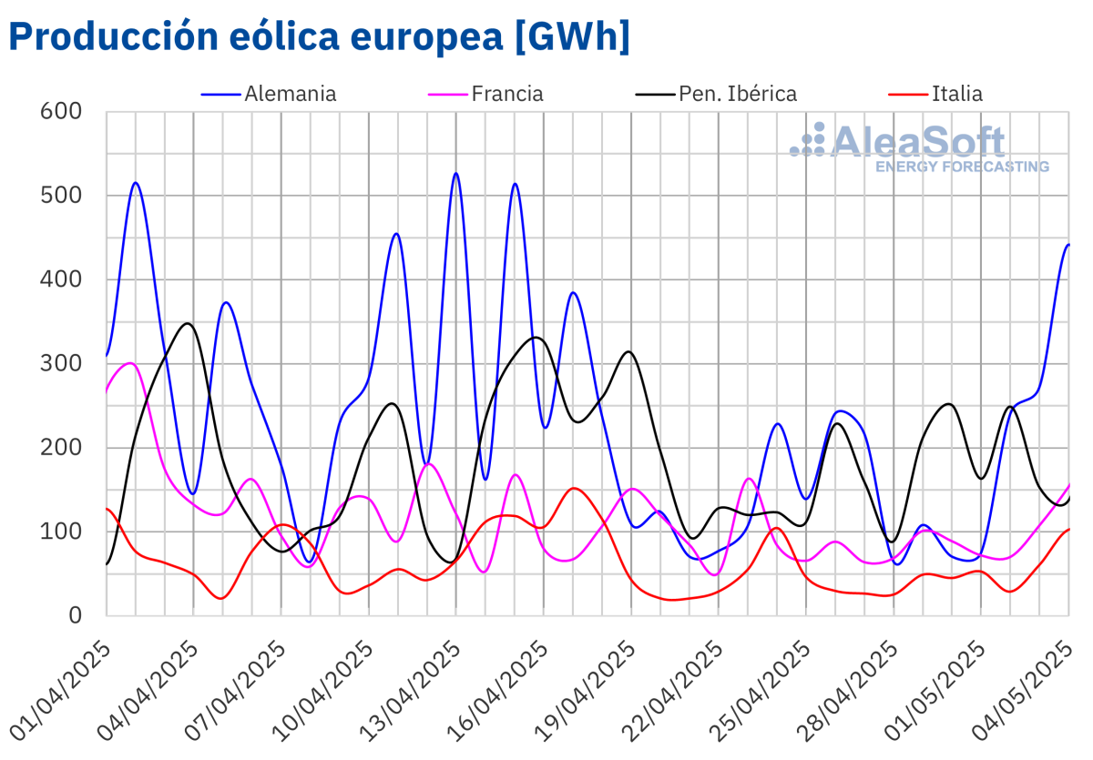 Durante la semana del 28 de abril, la producción eólica aumentó en los principales mercados europeos, revirtiendo la tendencia descendente de la semana previa. En la península ibérica, a pesar del impacto del apagón del lunes 28, tanto España como Portugal cerraron la semana con aumentos, del 12% y 47%, respectivamente. Alemania, Italia y Francia también incrementaron su producción, con subidas del 18%, 17% y 10% en cada caso.