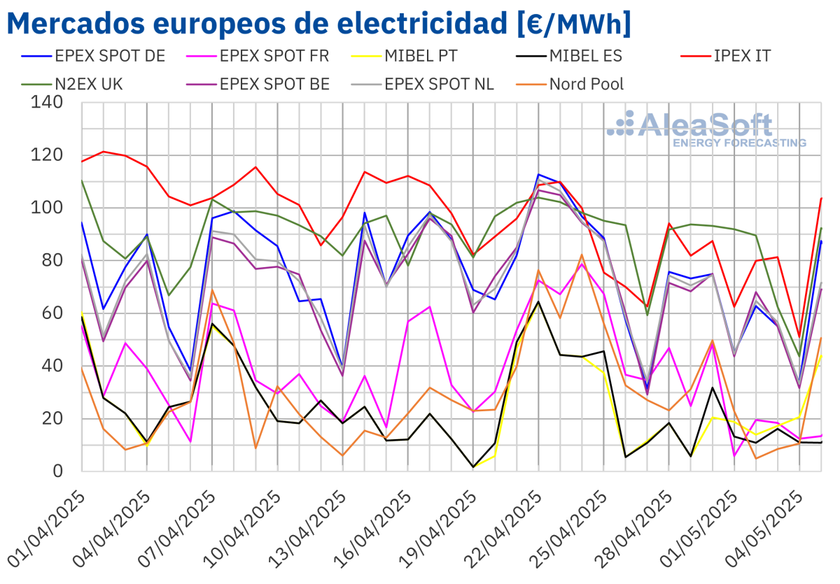 Fuente: Elaborado por AleaSoft Energy Forecasting con datos de OMIE, EPEX SPOT, Nord Pool y GME.