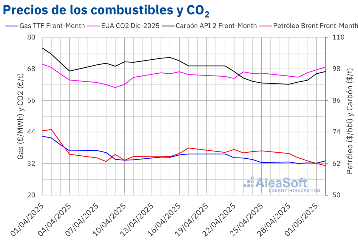 En la semana del 28 de abril, los precios de los principales mercados eléctricos europeos bajaron en comparación con la semana anterior. El descenso de la demanda y de los precios del gas, así como el aumento de la producción renovable favorecieron estos descensos. La fotovoltaica registró récords históricos de generación en Francia e Italia, así como la producción más alta para un día de abril en Alemania. La producción eólica aumentó en los principales mercados del continente. Los futuros de gas TTF alcanzaron el precio de cierre más bajo desde julio de 2024 y los de Brent desde marzo de 2021.