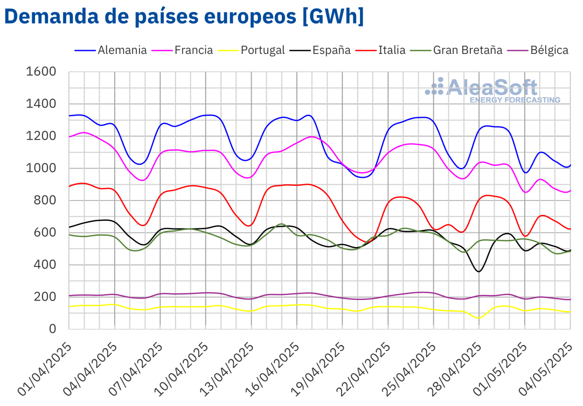 Según las previsiones de demanda de AleaSoft Energy Forecasting, la demanda aumentará en la mayoría de los principales mercados europeos durante la semana del 5 de mayo. España y Portugal experimentarán una recuperación tras el impacto del apagón y el festivo. En cambio, en Gran Bretaña se espera una ligera bajada, asociada en parte al festivo nacional del lunes 5 de mayo, “Early May Bank Holiday”.