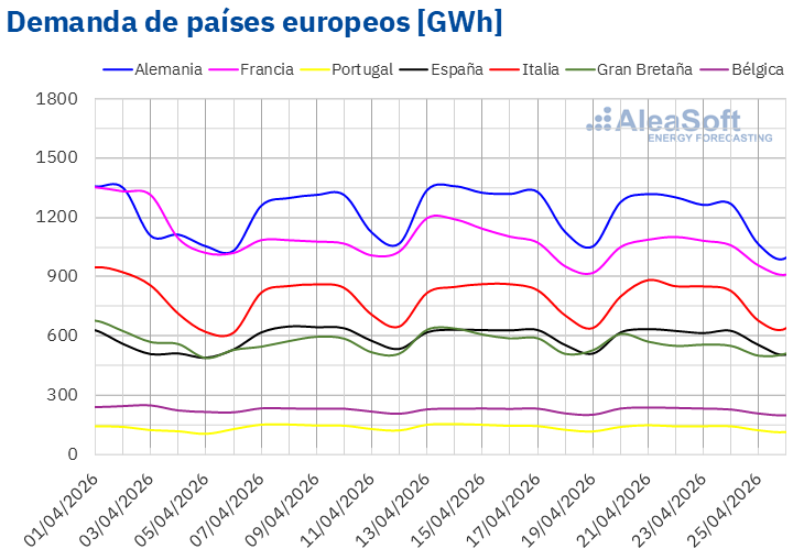 Fuente: Elaborado por AleaSoft Energy Forecasting con datos de ENTSO-E, RTE, REN, Red Eléctrica y TERNA.Fuente: Elaborado por AleaSoft Energy Forecasting con datos de ENTSO-E, RTE, REN, Red Eléctrica y TERNA.