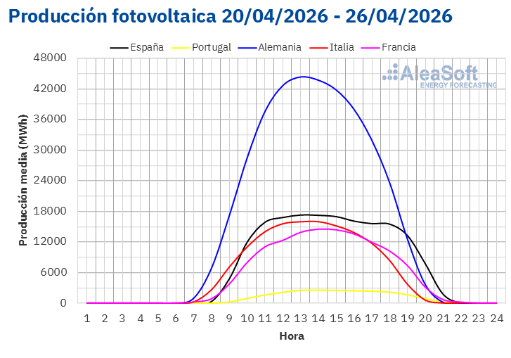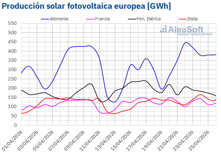Durante esa semana, la mayoría de los mercados analizados alcanzaron récords de producción solar fotovoltaica. El lunes 20 de abril, el mercado francés registró valor más alto para un día de abril, con 149 GWh de generación solar fotovoltaica. El mercado alemán alcanzó su producción más alta para un día de abril el 22 de abril, con 444 GWh. Finalmente, el viernes 24 de abril, el mercado italiano registró su récord histórico de producción solar fotovoltaica al generar 163 GWh de energía solar. Ese mismo día, el mercado portugués generó 28 GWh y alcanzó su valor más alto de producción con esta tecnología para un día de abril.