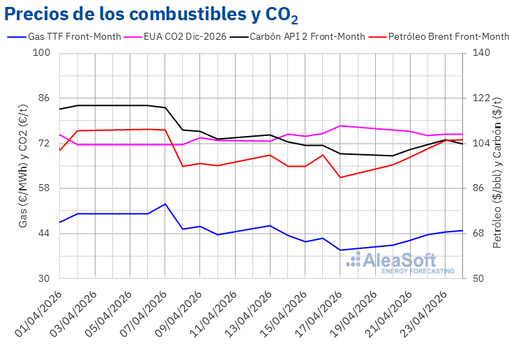 Por lo que respecta a los futuros de derechos de emisión de CO2 en el mercado EEX para el contrato de referencia de diciembre de 2026, el lunes 20 de abril, alcanzaron su precio de cierre máximo semanal, de 76,15 €/t. Este precio ya fue un 1,7% inferior al del viernes anterior y los descensos de precios continuaron hasta el día 22 de abril. Ese día, estos futuros registraron su precio de cierre mínimo semanal, de 74,42 €/t. En las dos últimas sesiones de la semana, los precios de cierre se recuperaron ligeramente, pero se mantuvieron por debajo de 75 €/t. El viernes 24 de abril, el precio de cierre fue de 74,91 €/t. Según los datos analizados en AleaSoft Energy Forecasting, este precio fue un 3,3% menor al del viernes anterior.