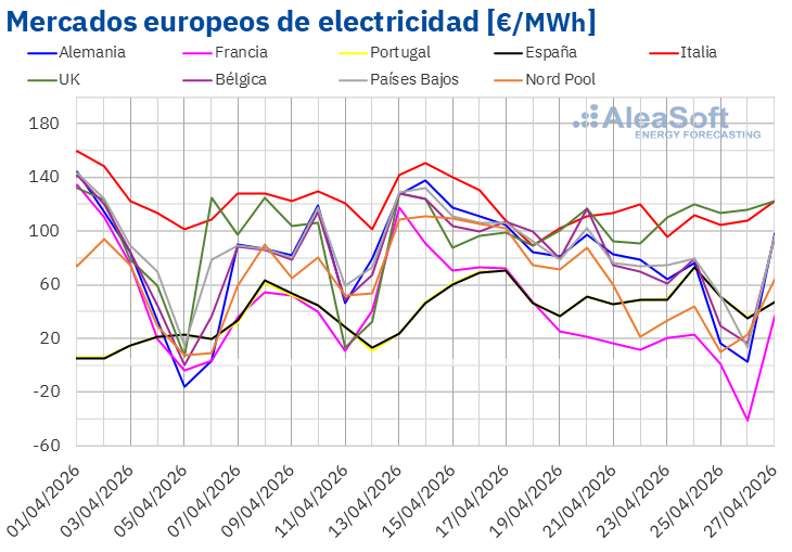 Fuente: Elaborado por AleaSoft Energy Forecasting con datos de OMIE, RTE, Nord Pool y GME.