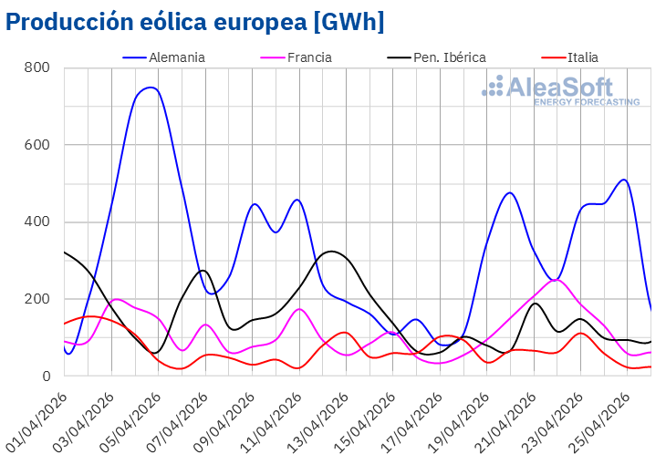 En la semana del 27 de abril, según las previsiones de producción eólica de AleaSoft Energy Forecasting, la producción eólica disminuirá en todos los mercados analizados.
