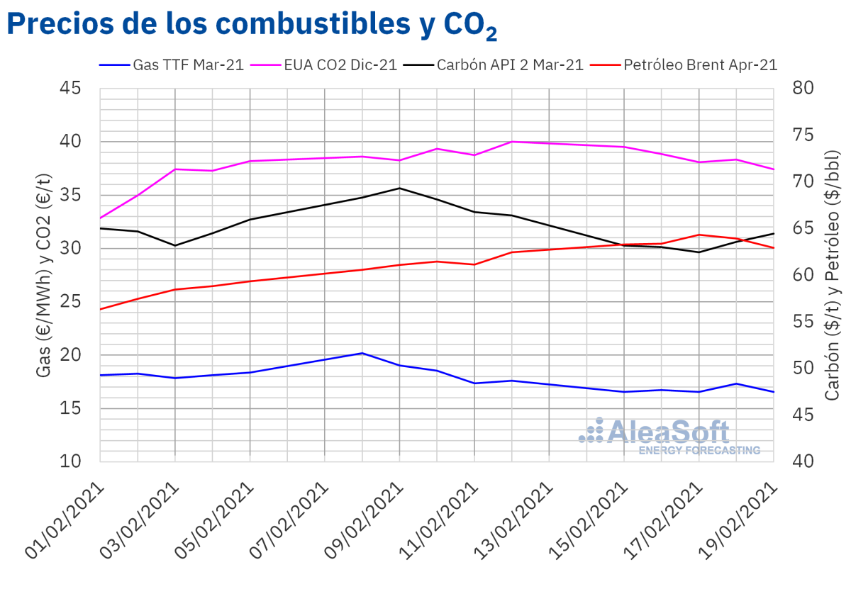 Los precios de los mercados eléctricos europeos bajaron de forma generalizada en la tercera semana de febrero, por la caída de la demanda y el aumento de la producción solar y eólica. El mercado MIBEL fue el de menor precio durante toda la semana, lo que ha sucedido casi cada día del mes. Los precios de los futuros de electricidad europeos, de gas y CO~2~ también bajaron, pero los últimos siguieron sobre los 37 €/t. Sin embargo, los futuros del Brent superaron los 63 $/bbl por primera vez desde mayo de 2019.