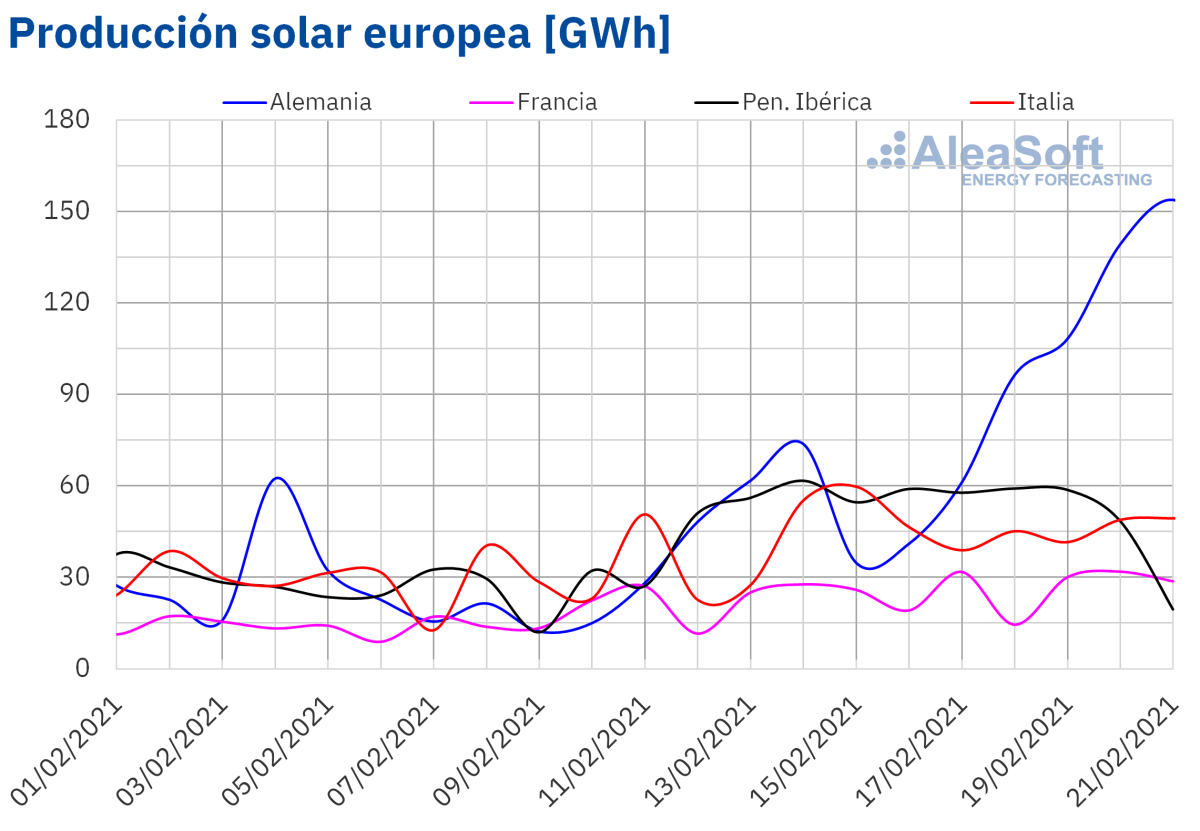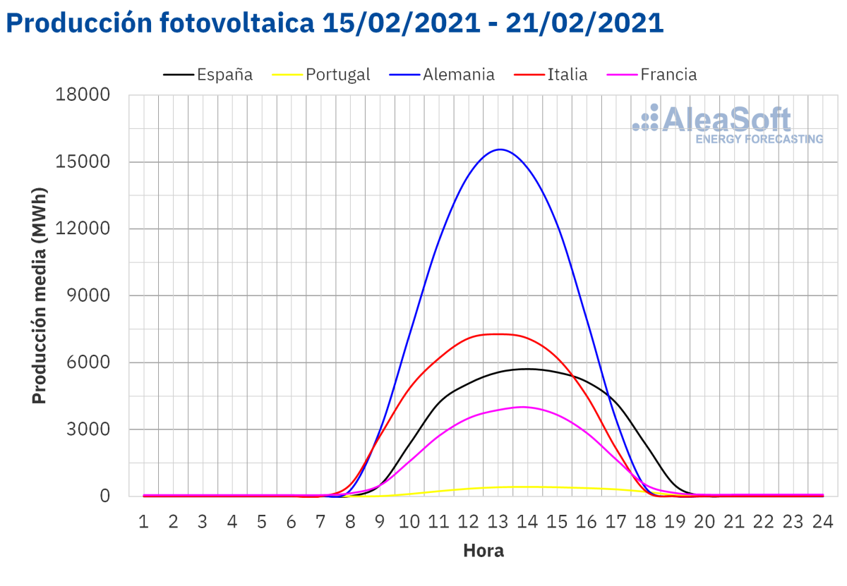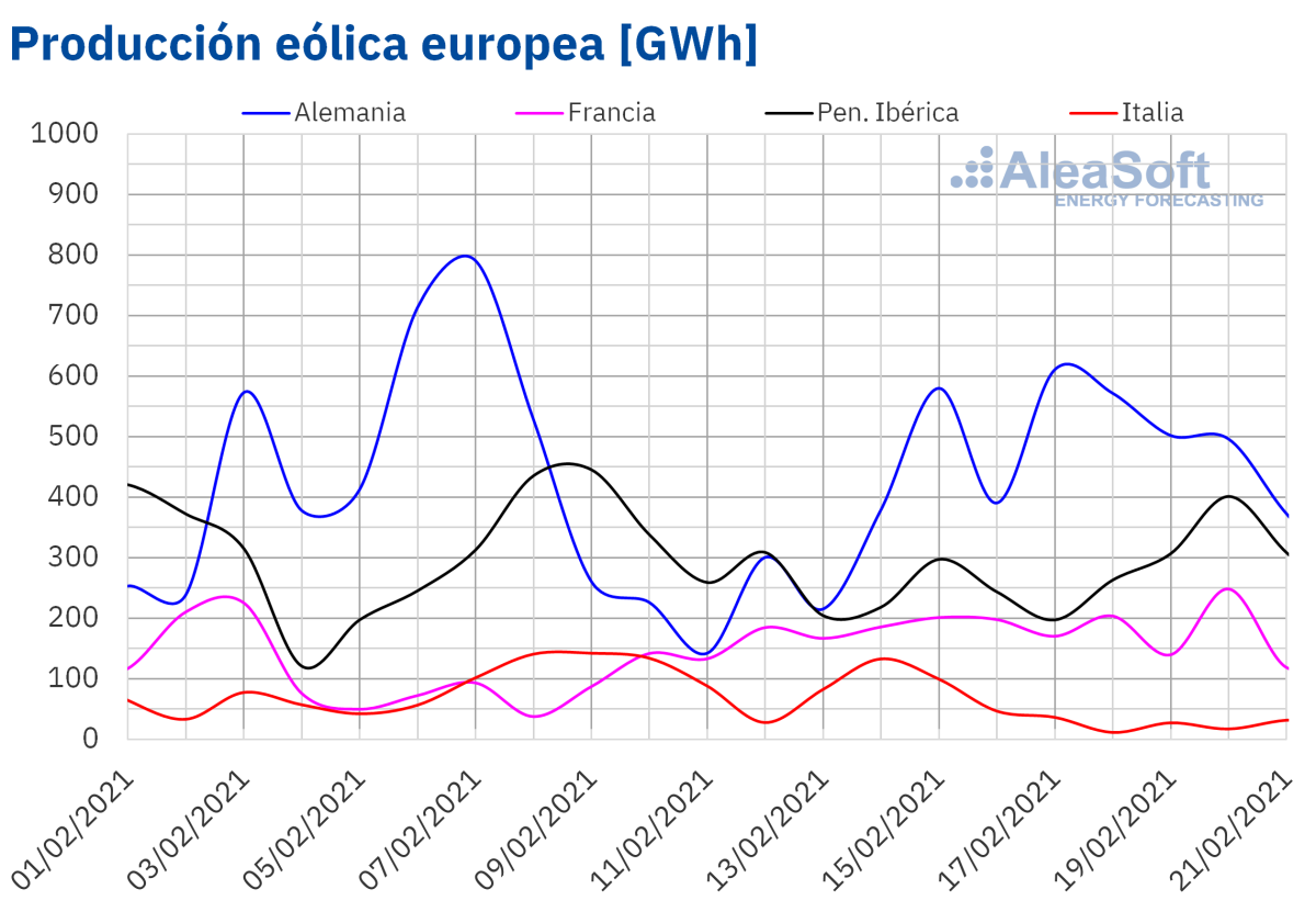 Durante la semana que comenzó el 15 de febrero, la producción eólica aumentó un 72% en el mercado alemán en comparación con la semana del 8 de febrero. En el mercado francés la producción fue un 37% mayor mientras que en el mercado italiano y en la península ibérica la producción cayó un 64% y un 8,7% respectivamente. En el caso de la península ibérica, el promedio de la producción registrada entre el viernes 19 y el domingo 21 de febrero fue un 7,3% superior al promedio de la producción de la semana del 8 de febrero.