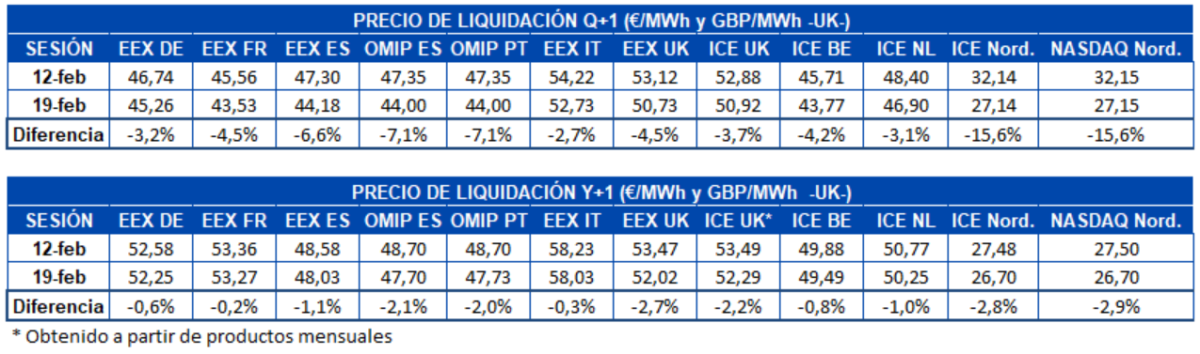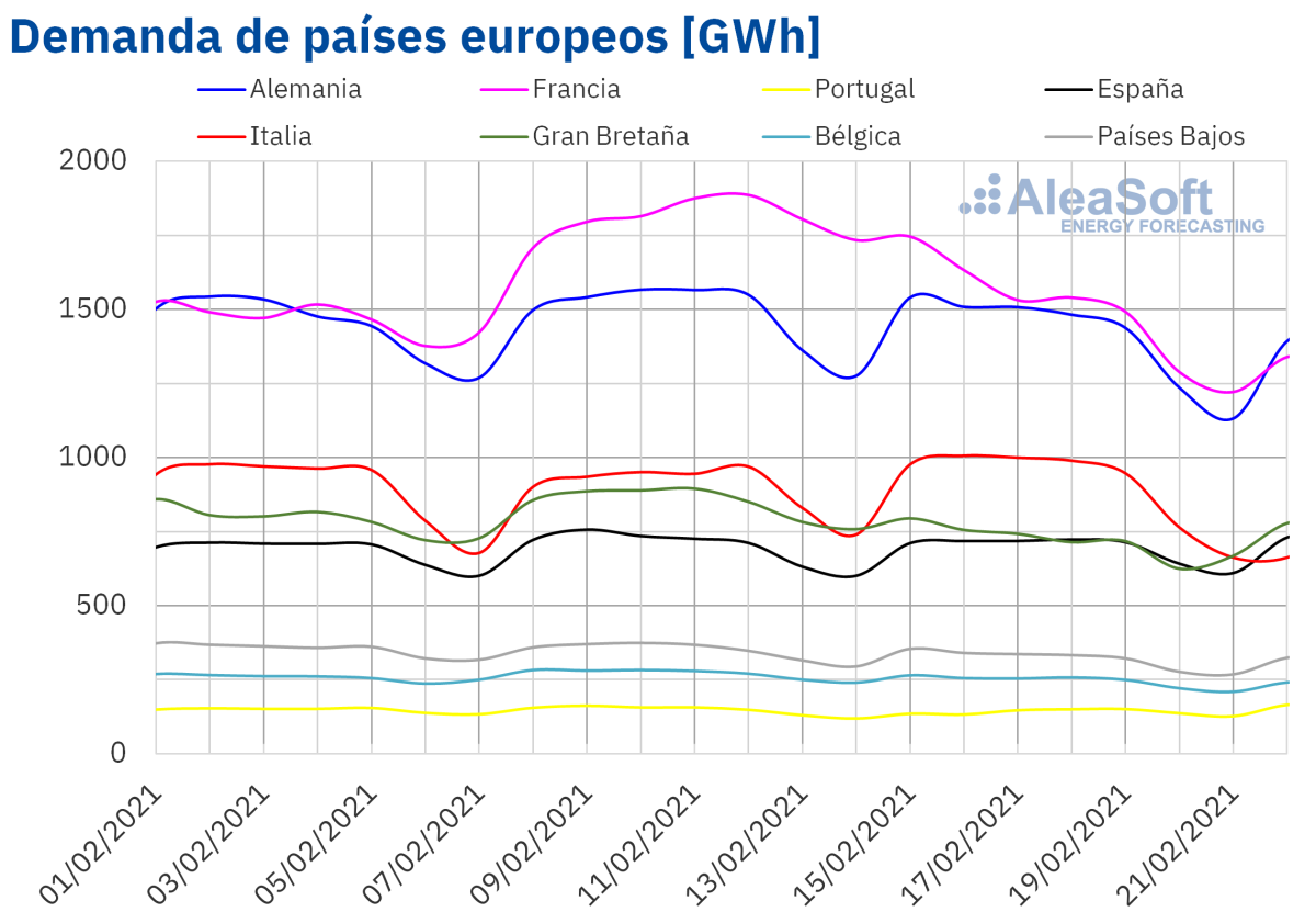 En la semana del 15 de febrero, la recuperación de las temperaturas después del paso de la tormenta Darcy por Europa fue el factor más influyente en el descenso de la demanda en la mayoría de los mercados europeos. Las temperaturas medias intersemanales se incrementaron más de 11 °C en los mercados de Alemania, Países Bajos y Bélgica. En cuanto al comportamiento de la demanda, resaltan los descensos superiores al 15 % en Francia y Gran Bretaña. La excepción a las subidas de la demanda fue el mercado italiano que registró un aumento de un 1,2%.