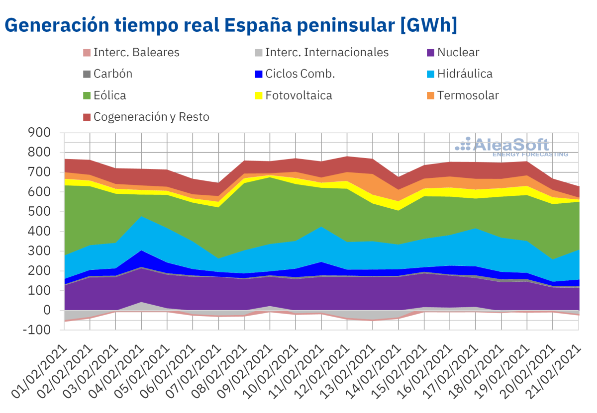 Los precios bajos del 20 y 21 de febrero se produjeron por el aumento de la producción eólica, a lo que se sumó la disminución de la demanda durante el fin de semana. En España, las centrales nucleares Ascó I, Ascó II, Cofrentes y Vandellós II tuvieron que reducir su potencia para ayudar a absorber el aumento de la producción eólica. No obstante, se continuó produciendo con cogeneración, ciclos combinados y con carbón. Durante ese fin de semana, España se posicionó como exportador neto de electricidad.