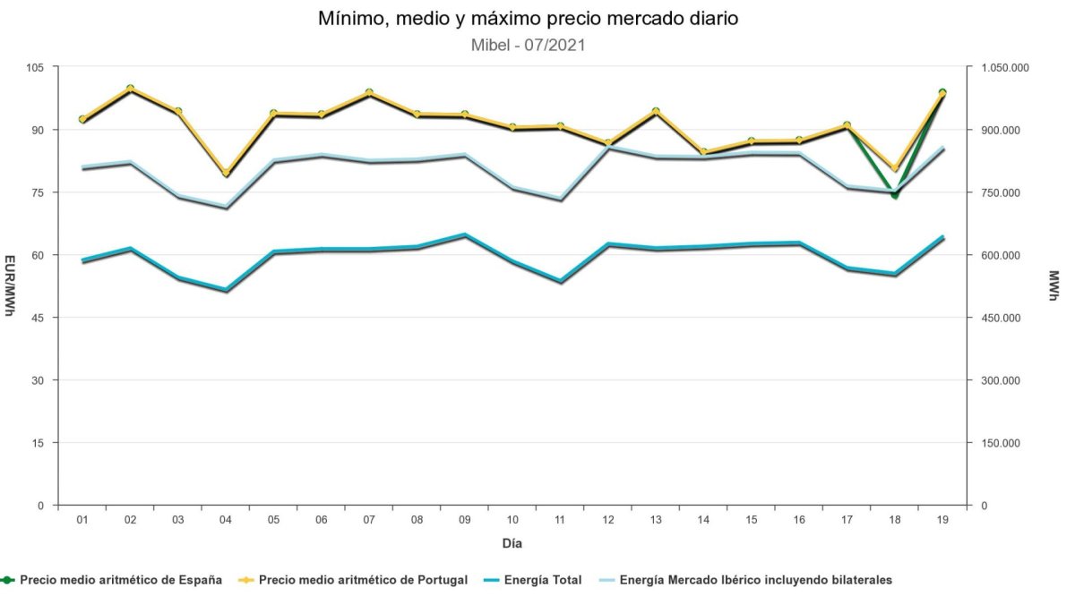 Este lunes 19 de julio de 2021 también pasará a la historia del mercado mayorista de electricidad en España tras registrarse el tercer precio más caro de la historia. Según los datos del operador del mercado ibérico (OMIE), el precio para este lunes alcanza los 98,8 €/MWh.