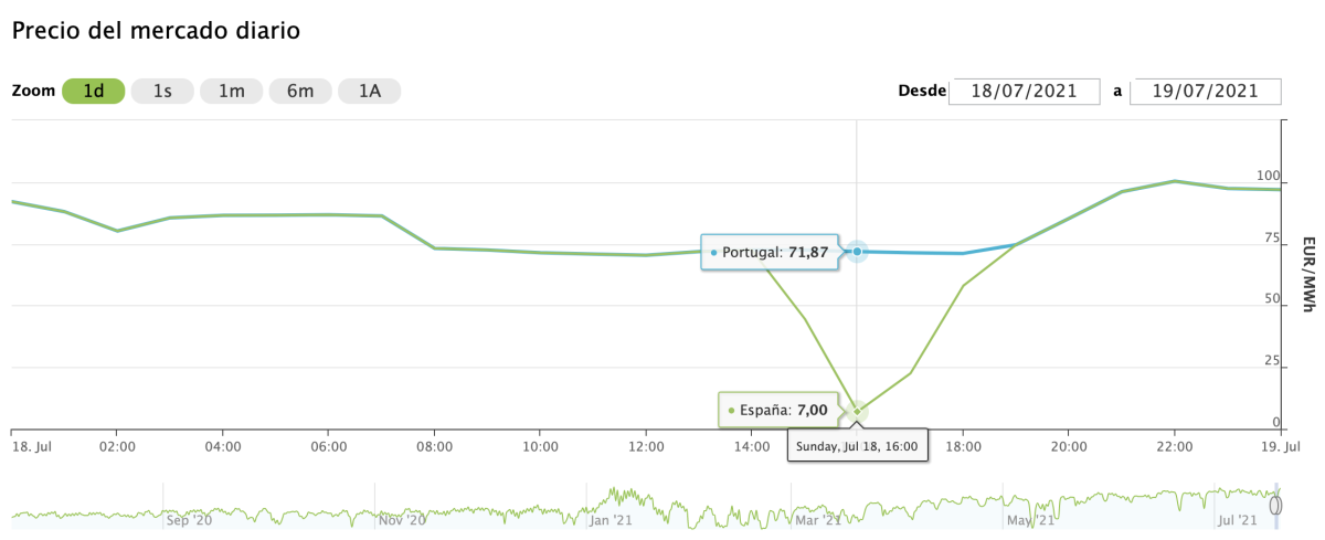 Lo que más sorprende de esta curva de precios es el diferencial con Portugal en eese momento, ya que los lusos no consiguieron bajar su precio y se mantuvo por encima de los 71 €/MWh. Este desacople entre ambos mercados se da a menudo, pero no con tanta diferencia entre mercados.