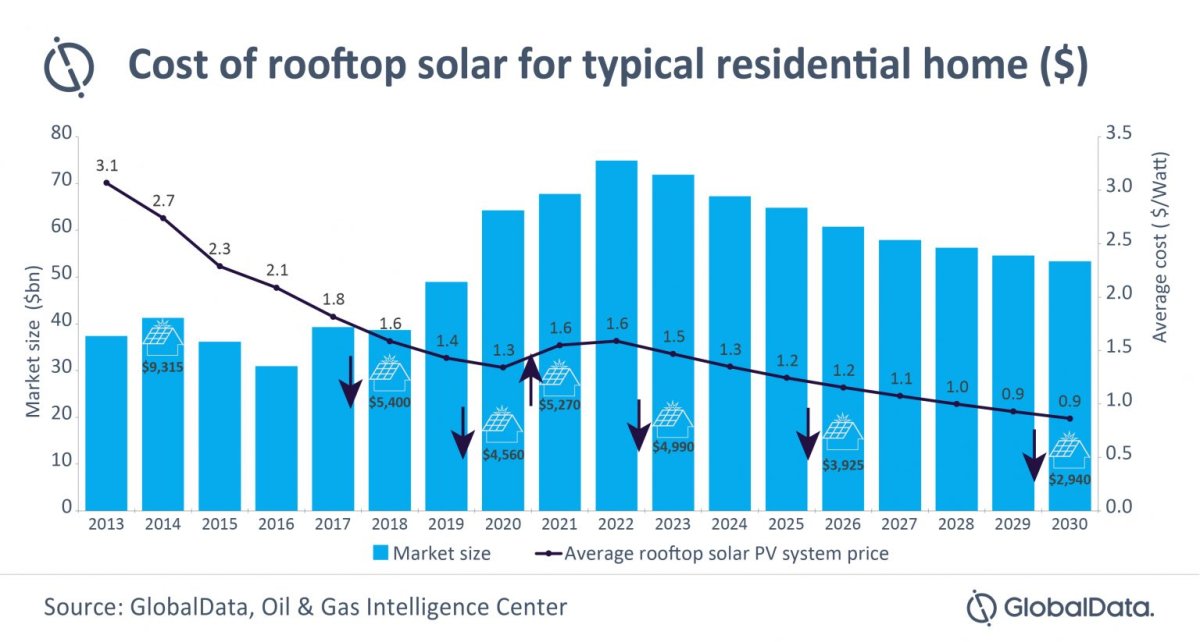 Attaurrahman Ojidaram Saibasan, analista de energía de GlobalData, dice: “Para poner esto en perspectiva, el costo de instalar un sistema solar en el tejado de una vivienda unifamiliar fue de alrededor de $9.300 en 2014. Esto se redujo entre $600 y $900 cada año, hasta situarse en 2020, en $4.550. En 2021, este precio aumentó $700, un costo que no se veía desde 2018. No esperamos que estos costos vuelvan a bajar hasta 2023”.