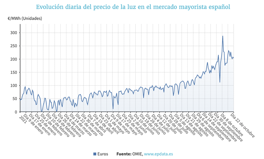 En concreto, el precio de este viernes será el duodécimo día más caro de la historia, aunque lejos de los 288,53 euros/MWh que se alcanzaron el 7 de octubre y que, hasta la fecha, marcan el récord absoluto.