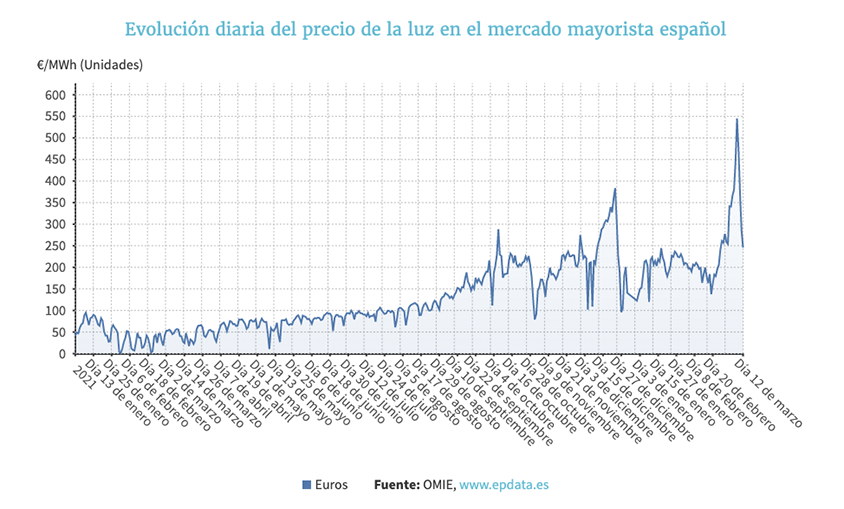 A pesar de la moderación del precio en las últimas cuatro jornadas, el precio medio del megavatio por hora en el mercado mayorista en lo que va de marzo se sitúa en 358,45 euros, es decir, casi 120 euros más que el promedio de diciembre de 2021, el hasta ahora mes más caro de la historia con 239 euros de media.