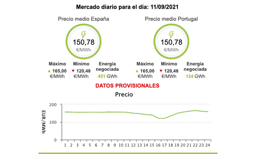 En comparación con el mismo día del año pasado, cuando el precio medio diario se situó en 46,96 euros por MWh, el precio de este sábado es más de tres veces superior.