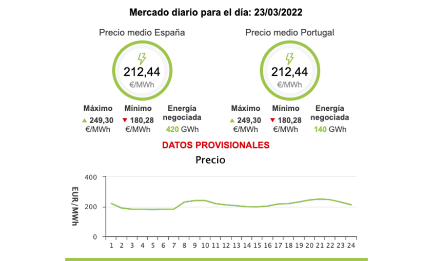 El pasado 24 de febrero, cuando comenzó la invasión rusa de Ucrania, el precio del mercado mayorista estaba en 205,6 euros/MWh y, desde entonces, se produjo una escalada diaria del precio que tuvo su punto álgido el pasado 8 de marzo, cuando la cotización se situó en el récord absoluto de 544,98 euros/MWh.