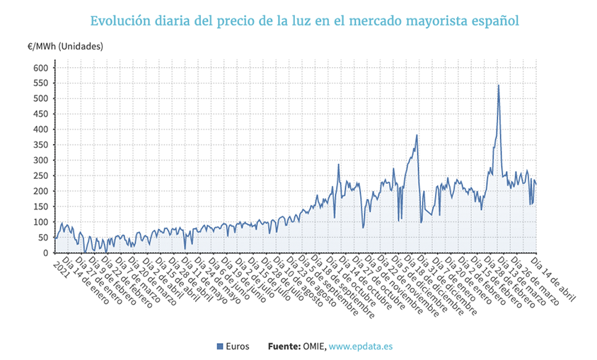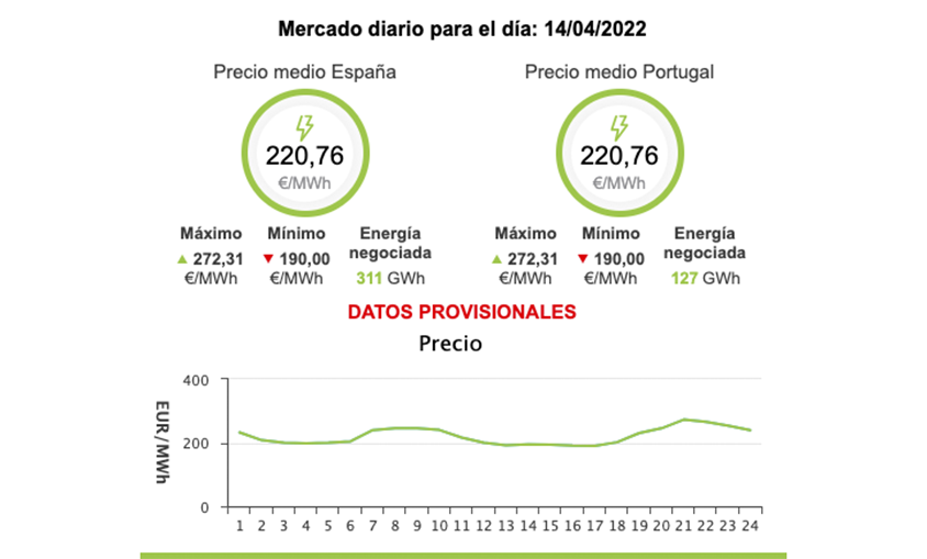 En comparación con hace justo un año, el precio del 'pool' para este jueves será un 198,5% superior a los 73,96 euros/MWh del 14 de abril de 2021.
