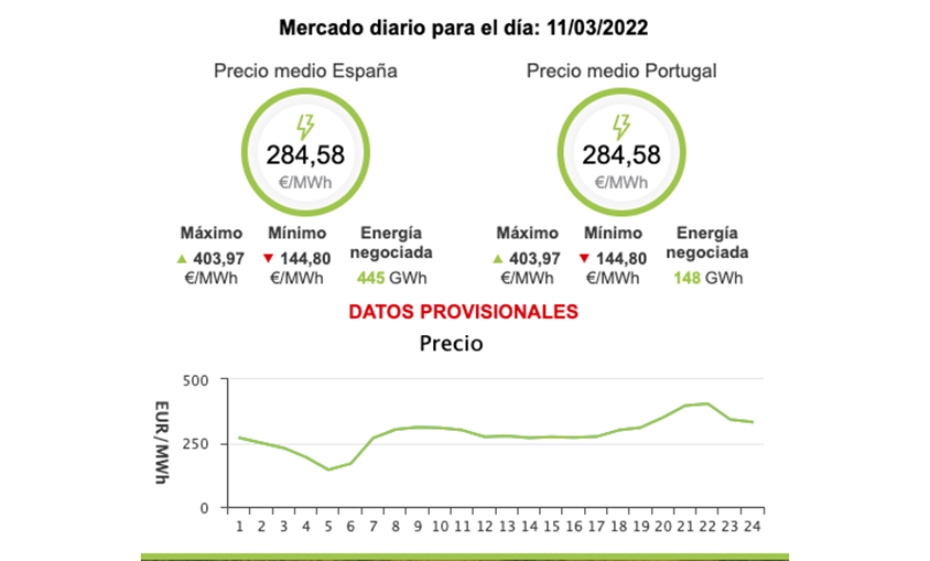 El precio medio de la electricidad en el mercado mayorista bajará este viernes un 23,03%, hasta los 284,58 euros el megavatio/hora (MWh), por lo que se aleja por tercera jornada consecutiva del máximo histórico registrado el 8 de marzo, cuando se alcanzaron los 544,98 euros/MWh en el marco de la espiral alcista del gas natural por el impacto de la guerra en Ucrania.