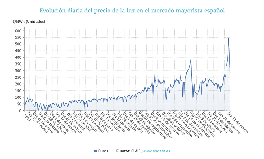 En lo que va de marzo, el precio medio del megavatio por hora en el mercado mayorista se sitúa en 368,66 euros, es decir, casi 130 euros más que el promedio de diciembre de 2021, el hasta ahora mes más caro de la historia con 239 euros de media.