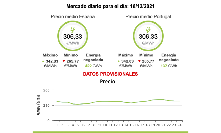 De este modo, el precio de la luz se mantendrá por encima de la cota de los 300 euros por tercer día consecutivo, a pesar del ligero descenso en su cotización (-0,92%) -algo habitual los fines de semana debido a la caída de la demanda- en comparación con la de este viernes, 17 de diciembre, que registra el máximo valor de la serie histórica con 309,2 euros/MWh.