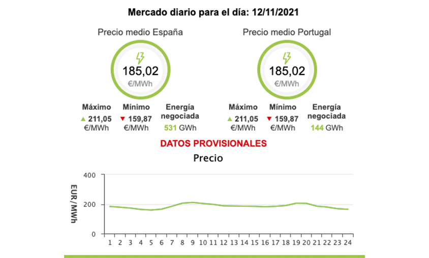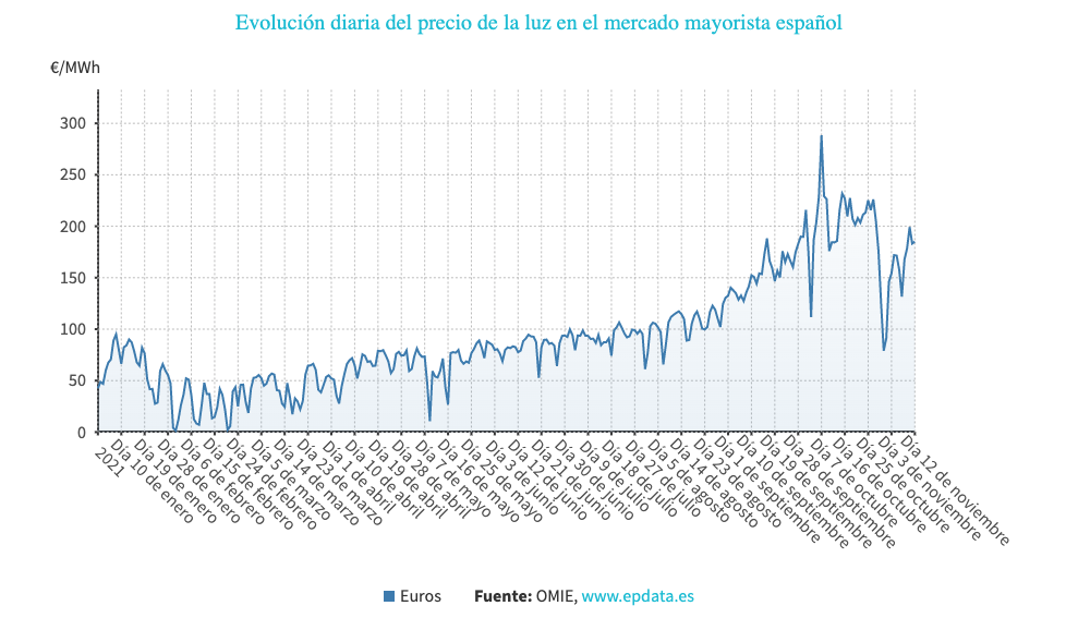 En términos anuales, la luz se ha disparado un 304%, ya que el 12 de noviembre de 2020 el precio medio para ese día fue de 43,3 euros el megavatio hora.