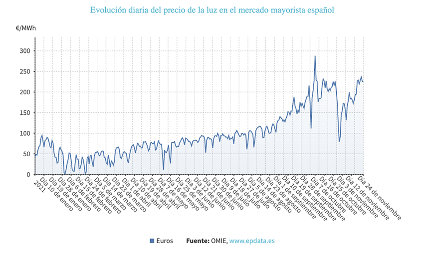 En lo que va de mes de noviembre, el 'pool' registra una media de unos 185 euros/MWh, unos 15 euros menos que los 200 euros/MWh en que cerró octubre, aunque multiplica por más de cuatro los 41,94 euros/MWh del mes de noviembre de 2020.
