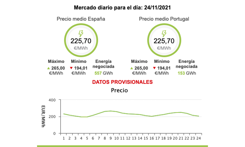 El precio máximo de la luz para este 24 de noviembre se dará entre las 09.00 y las 10.00 horas, con 265 euros/MWh, mientras que el precio mínimo se registrará entre las 5.00 y las 6.00 horas, con 194,01 euros/MWh.