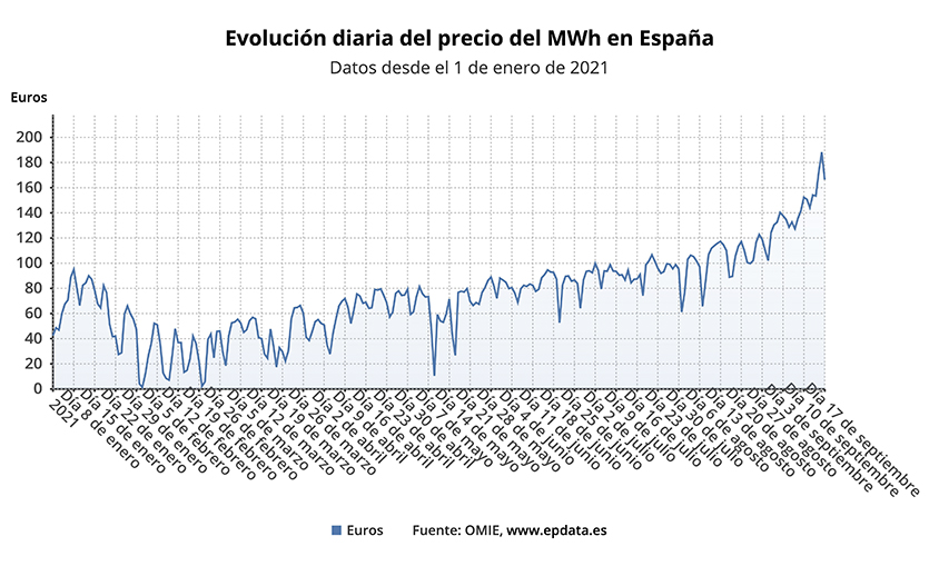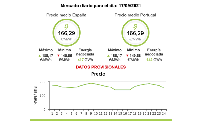 El precio del megavatio hora de este viernes será un 253% más alto que el del mismo día del año pasado, cuando registró un precio de 47,11 euros/MWh, y un 9,17% más caro que el del viernes de la semana pasada, 10 de septiembre, cuando alcanzó los 152,32 euros/MWh.