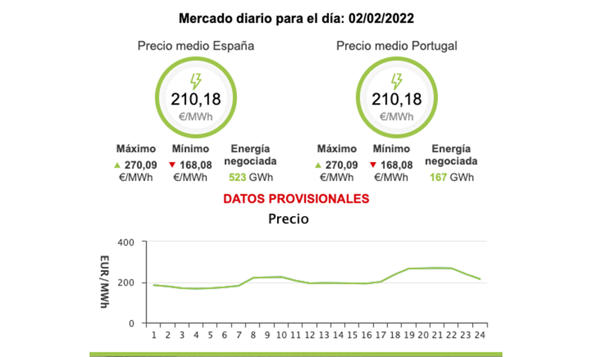 En concreto, el precio medio del 'pool' se situará este miércoles en los 210,18 euros/MWh, 3,64 euros por encima de los 206,54 euros/MWh de este martes, según datos publicados por el Operador del Mercado Ibérico de Energía (OMIE) recogidos por Europa Press.