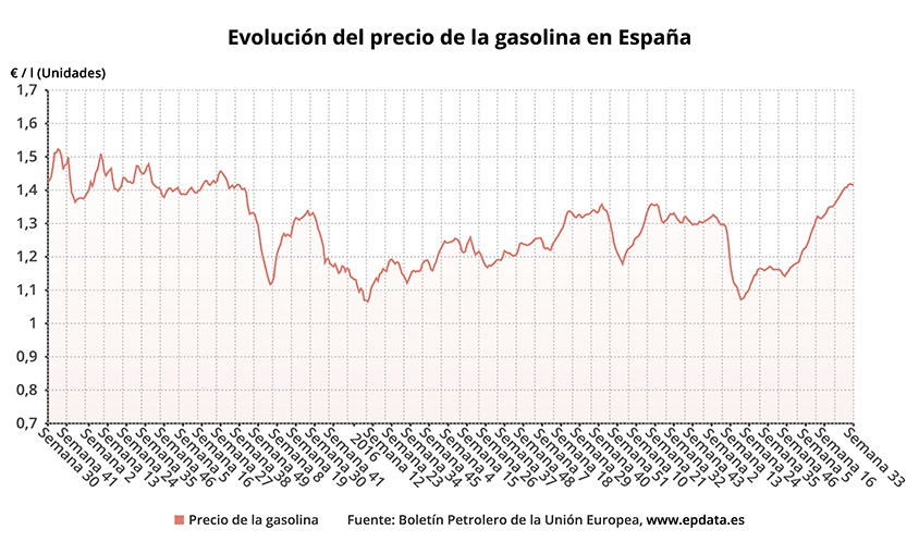 A pesar de estos niveles, el precio de la gasolina sin plomo de 95 está en España por debajo de la media de la UE, situada en 1,538 euros el litro, y de la zona euro, con un precio medio de 1,591 euros. En el caso del diésel ocurre otro tanto, ya que el precio en la UE es de 1,361 y de 1,384 en la zona euro.