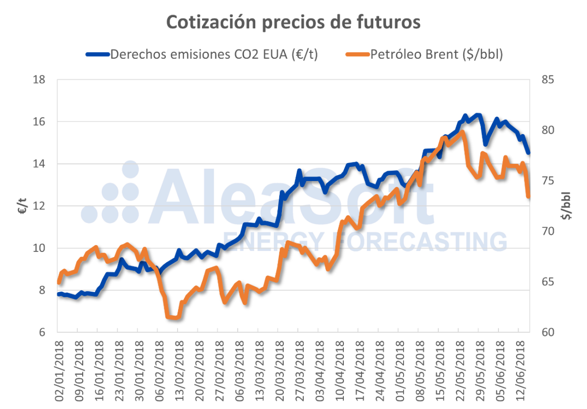 El precio de los futuros de los derechos de emisiones de CO~2~ EUA para el contrato referencia de diciembre 2018 cayó un 6,2% durante la semana pasada, con la caída más pronunciada del jueves al viernes, un 2,5%. La bajada de precios de la semana pasada es el primer signo de clara relajación del precio después de los valores registrados a finales de mayo, con un máximo de 16,31 €/t el 28 de mayo, que supusieron precios no vistos desde 2011. La redefinición del objetivo de producción renovable del 27% al 32% en la Unión Europea la semana pasada apunta a una reducción adicional de emisiones, hecho que requeriría de menos derechos a comprar, que a su vez presionaría los precios a la baja. AleaSoft considera que la recogida de beneficios después de los altos precios y las perspectivas de aumento de derechos disponibles en las subastas de los próximos meses, apuntan a ser los principales factores de la bajada de precios. Hoy lunes 18 de junio, su cotización en el mercado ICE Futures Europe ha abierto ligeramente al alza.
