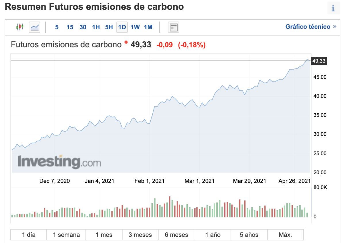 El precio del CO2 ya ha superado la barrera de los 50 euros por tonelada. Esto supone que se esté pagando un precio de la electricidad bastante más caro cuando se genera con tecnologías que producen con combustibles fósiles como el carbón o los ciclos combinados.