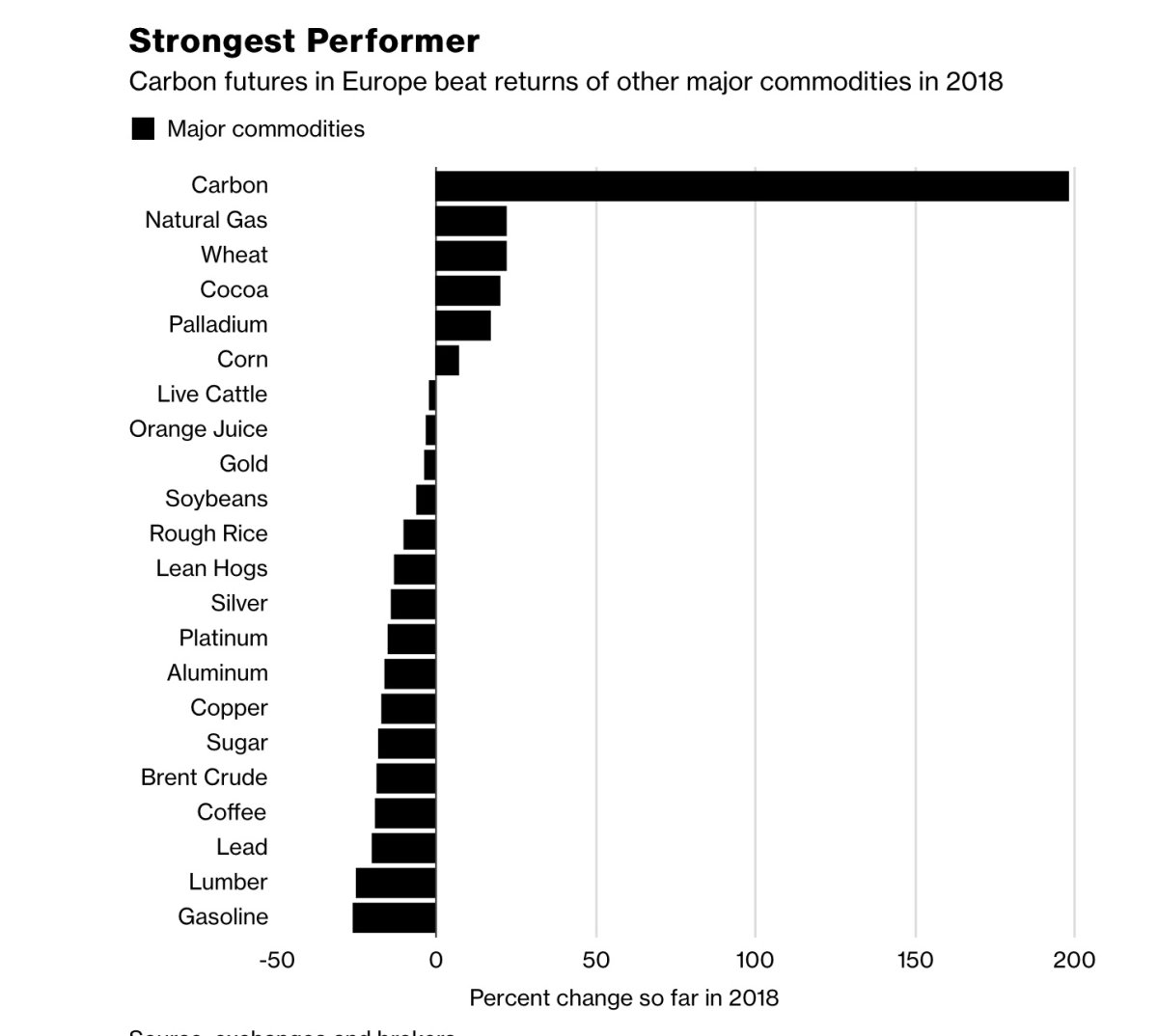 Además, los futuros de carbono, que reflejan el precio que las fábricas y las eléctricas pagan por sus emisiones, se triplicaron en 2018, lo que lo convierte en el principal producto con mejor desempeño del año, según publica Bloomberg. Esos contratos pueden incrementarse de nuevo en 2019, incluso superar un crecimiento del 20%, situándose cerca de los 29 euros por tonelada o incluso más, por primera vez en más de una década. 2018 ha marcado un antes y un después en el mercado de emisiones y 2019 no será quien le pare los pies.