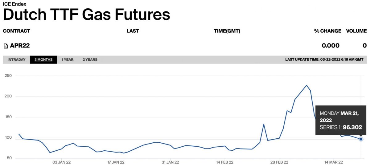 La materia prima, que ya tenía un precio elevado durante la escalada previa al conflicto, ha cotizado por encima de 100 euros el MWh desde que comenzó el mes de marzo, según los datos del Bloomberg consultados por Efe.