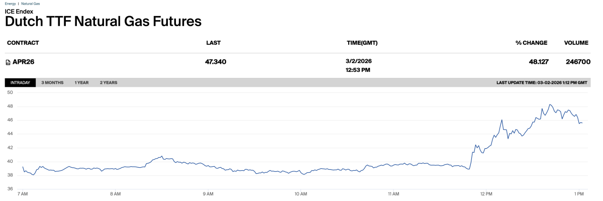 Comenzó la jornada el TTF en unos 32 €/MWh y en estos momentos cotiza por encima de los 47 €/MWh camino de superar la barrera psicológica de los 50 €/MWh